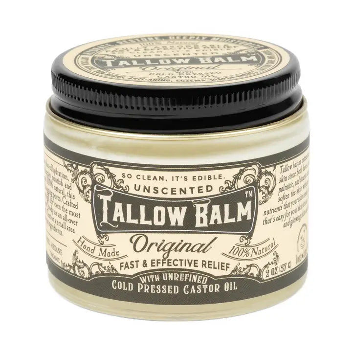At the heart of this formula is 100% grass-fed tallow, celebrated for its unparalleled compatibility with the skin’s natural structure. Rich in vitamins A, D, E, and K, this time-honored ingredient deeply moisturizes and supports skin barrier function like no other. Organic grass-fed beef tallow is a perfect, quality, non-toxic and moisturizing product for the skin. This is our unscented, solid balm version that has organic, cold pressed, hexane free castor oil for a smooth glide on the skin. It is unscented, meaing it does not have any added essential oils. Customers LOVE our whipped tallow but for those that can't do hemp seed oil this is a great alternative. The whipped tallow also melts in temps over 75 degrees and loses its whipped texture, this balm is solid so even if it melts in transit it will come back to shape at room temp CLEAN SIMPLE INGREDIENTS: 100% Grass-Fed Tallow*, Cold Pressed, Hexane Free Castor Oil*, Beeswax* (* denotes organic) Stored in a 2 oz, glass container