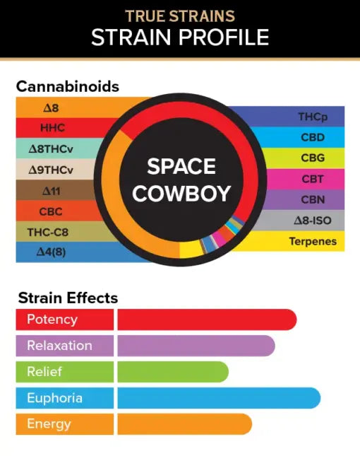 Introducing Space Cowboy, a well-balanced Hybrid that utilizes some of the most potent cannabinoids available to blast you into cosmic bliss. As a part of our True Strains lineup, this is part of the most consistent, complex blends with the widest range of effects available in the industry. As with all True Strains, Space Cowboy undergoes internal testing with our internally-developed D-SPEC testing before filling to ensure accuracy and is then sent to an ISO 17025-accredited lab for additional verification of contents and safety.